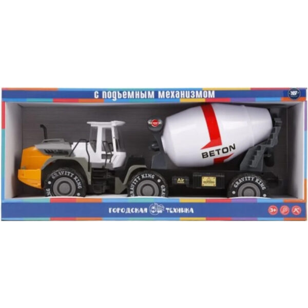 Бетономешалка инерционная — серия «Городская техника» Материал: пластик, металл Размер машины: 38.5х11.4х16 см Особенности модели: реалистичный внешний вид, вращающийся барабан, открывающийся капот, прорезиненные колеса, кабину можно отсоединить от прицепа, инерционный механизм движения Упаковка: открытая цветная коробка Размеры упаковки: 44х13х19.5 см